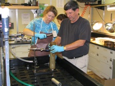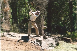Left: Jenny Paduan and Dave Clague extruding a sediment core on the RV Western Flyer. All the MBARI cruises were fun! Right: Chris Henry (Nevada Bureau of Mines and Geology) collecting a rock sample for geochronology from the Lake Tahoe area.