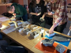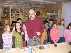 Left: teaching an igneous petrology lab during a power outage, 2025. Right: Doing a rock and minerals show for elementary school kids in 2003.