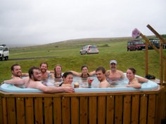 Left: In Morocco in 2018; Yvette Kuiper, Me, Richard Ernst, Hafida El-Bilali and Said Belkacim in front. Right: Students and me enjoying the hot tub on the Iceland field course in 2009.