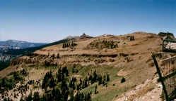 Right: The view of volcaniclastic deposits and lavas north of the Squaw Valley USA ski resort, Lake Tahoe. Right: Grad student Albert Stoffers sitting on thick volcaniclastic deposits north of Lake Tahoe.