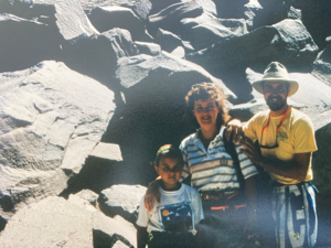 Left: At Disney World in 2023 with Caroline and Kristen’s family. Family times are the best of times! Right: Caroline and Kristen with me at the Devils’s Postpile, California, in 1992, while doing field work at Long Valley caldera.